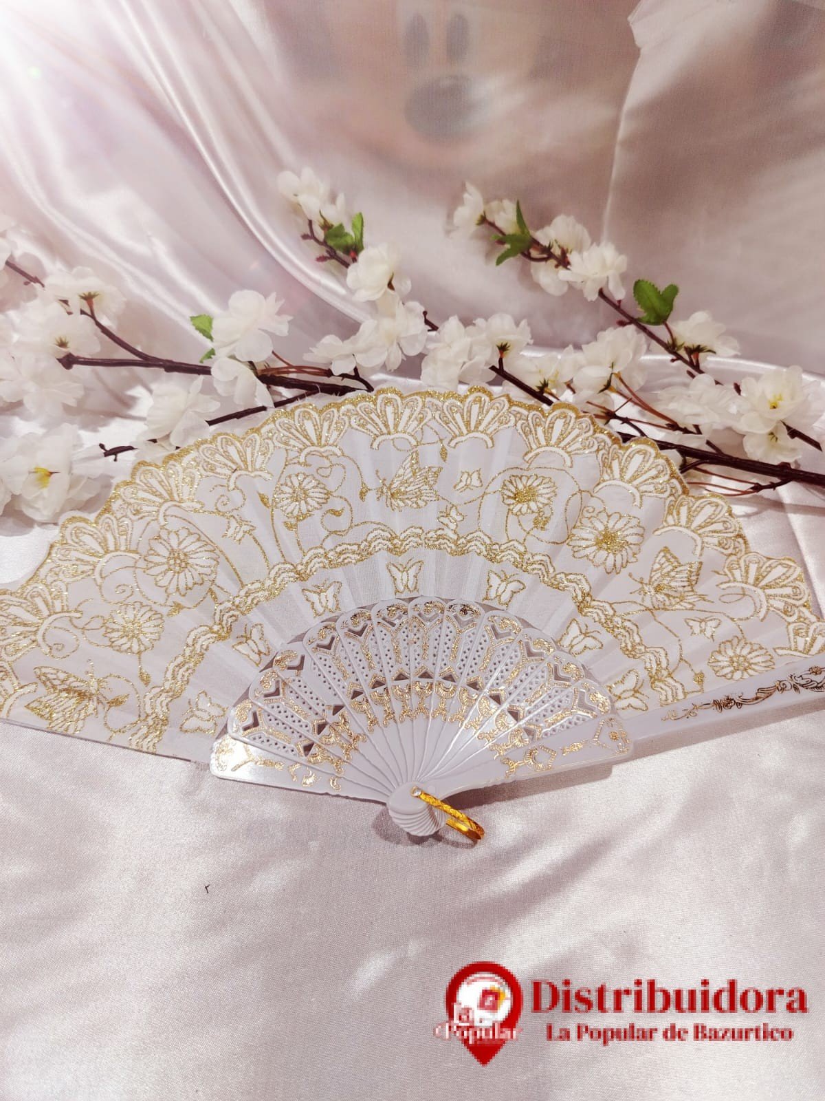 Hecho de tela, bordes de encaje y ribetes de plástico. Decoraciones doradas a lo largo de las costillas del ventilador;