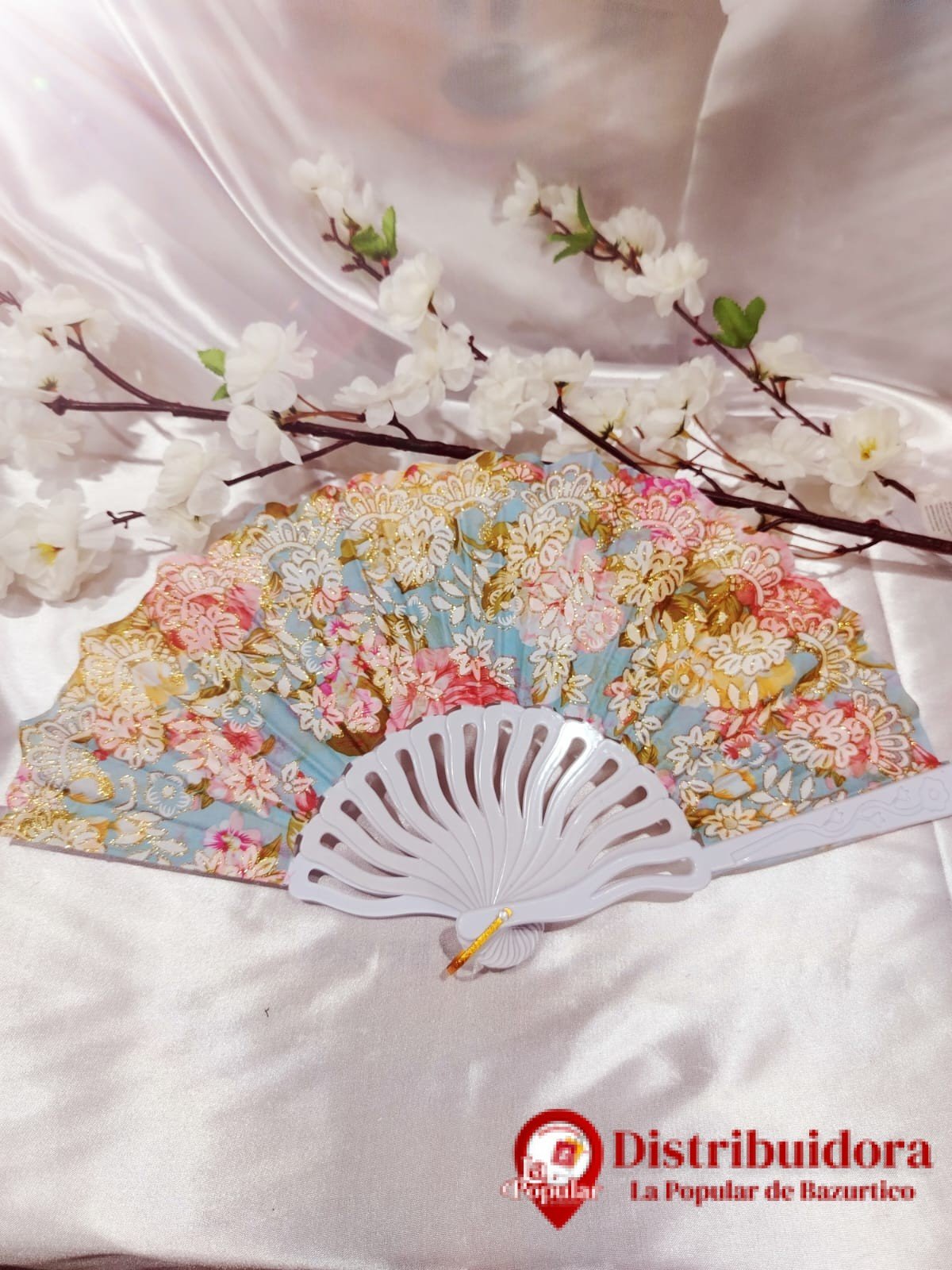 Hecho de tela, bordes de encaje y ribetes de plástico. Decoraciones doradas a lo largo de las costillas del ventilador;