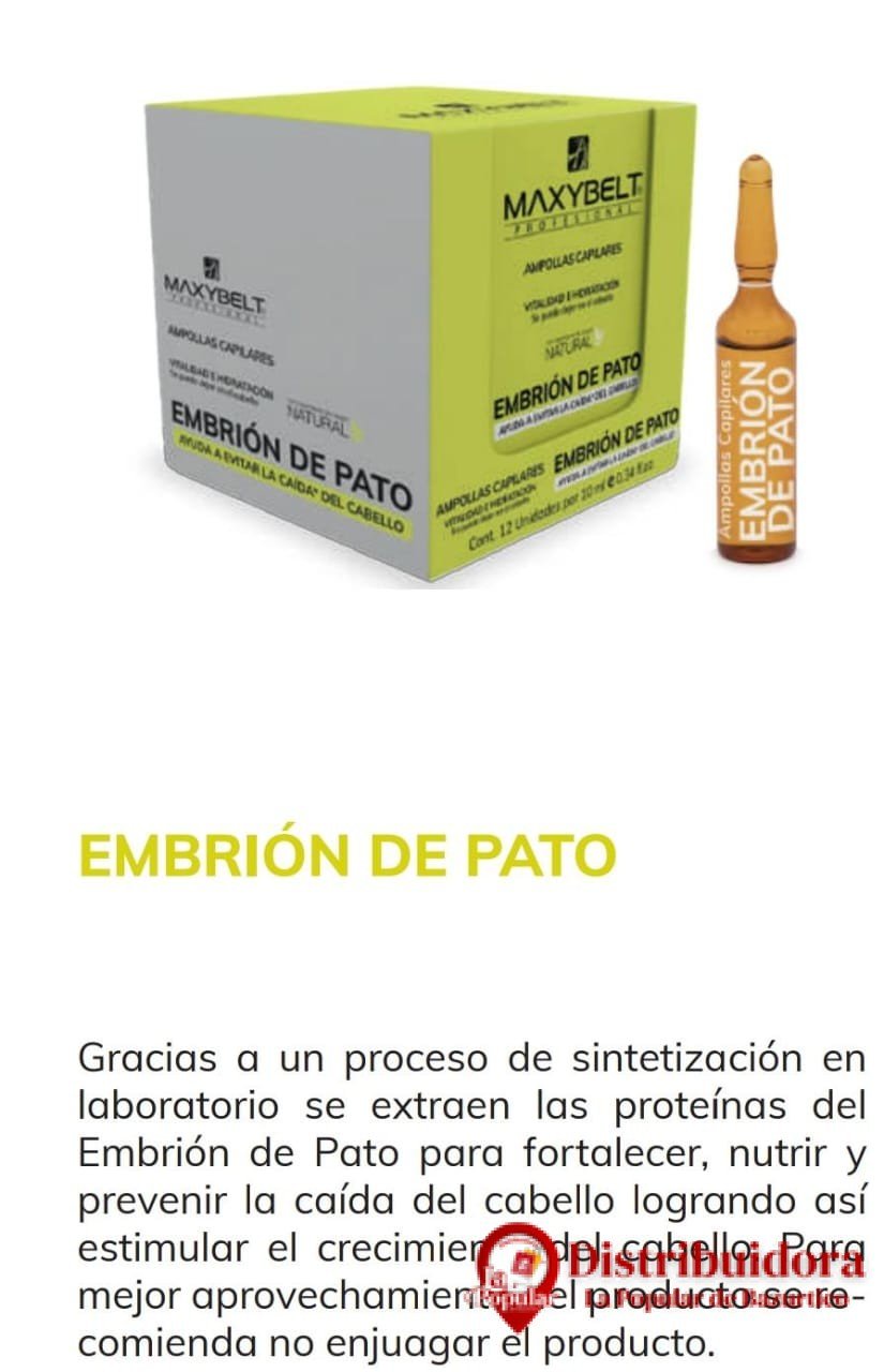 AMPOLLA EMBRION DE PATO, FORTALECE Y PREVIENE LA CAIDA, 10ML DE MAXYBELT $ 4.500