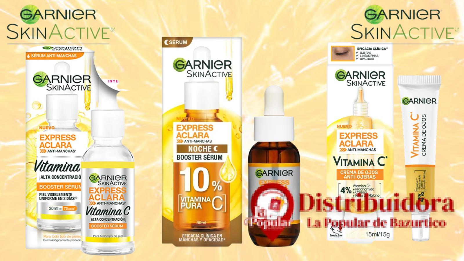 Garnier Express Aclara Serum Anti Manchas con alta concentración˄ de Vitamina C° dejándote una piel uniforme con una eficacia clínica comprobada que reduce la intensidad de las manchas oscuras hasta un 41%. °Derivado *Estudio de uso. 150 mujeres. (DISCLAIMER). MODO DE USO; PASO 1: Limpia tu rostro