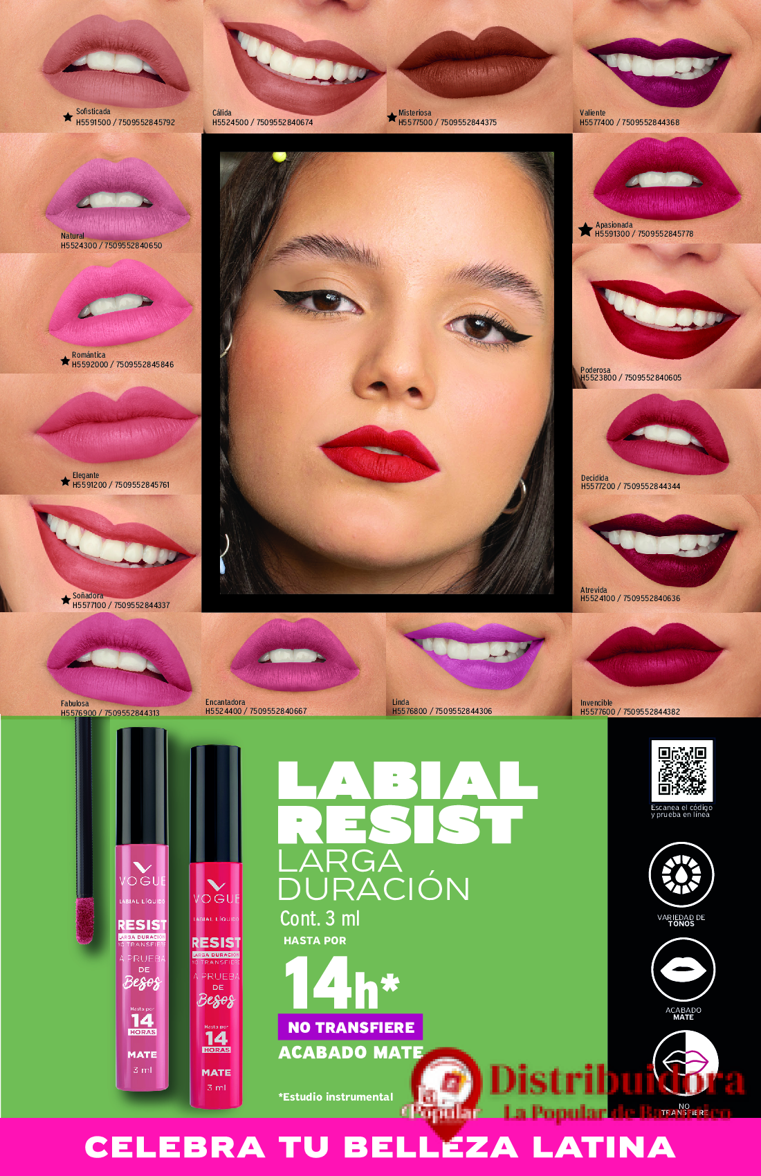 Descubre el labial liquido Resist a prueba de besos, un producto que brinda un acabado 100% mate, duración de hasta 14 horas que no transfiere con una fácil aplicación que brinda color intenso.